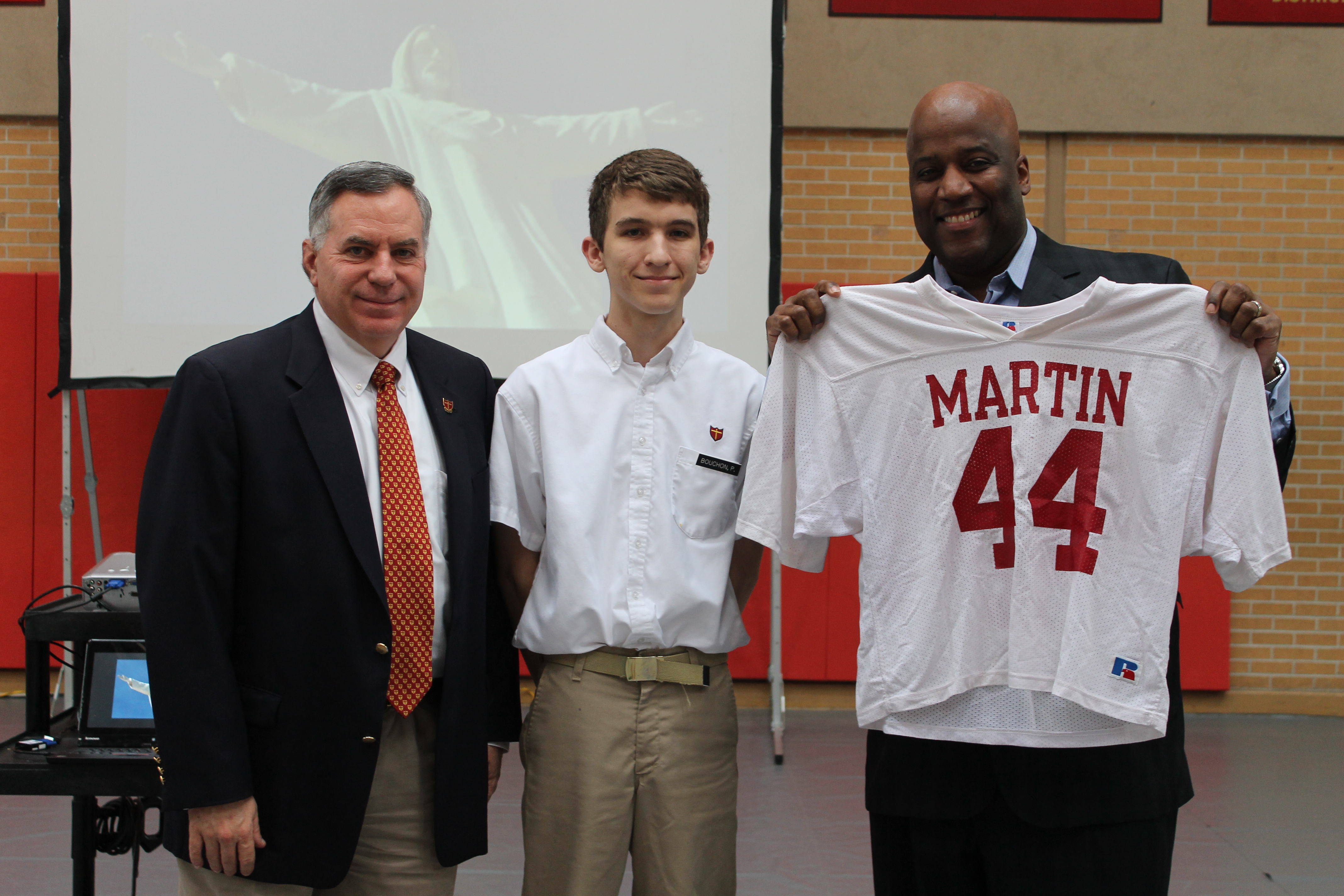 On Friday, April 15, the Brother Martin community celebrated their Easter Liturgy in the Robert M. Conlin Gymnsaium. Following the Mass, Mr. Rod West ’86 addressed faculty, staff, and students at the annual Alumnus of the Year Assembly. Development Director/Assistant to the President Tommy Mitchell ’79 introduced Mr. West prior to Mr. West’s speech. In conclusion, Mr. West was presented with his former Brother Martin football jersey by Mr. Mitchell and Patrick Bouchon ’16. Mr. Bouchon will be attending University of Notre Dame in the fall of 2016 where Mr. West received a Bachelor of Arts degree.