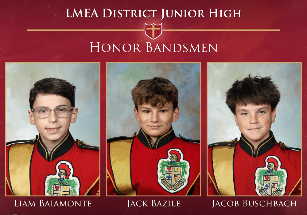 Brother Martin High School congratulates LMEA District Junior High Honor Band students Liam Baiamonte, Jack Bazile, and Jacob Buschbach. These bandsmen performed in the LMEA District VI Honor Band Concert at Tulane University in November and, according to Band Director, Mr. Dominick Caronna, Jr. '85, "exemplify the kind of band student who strives to make themselves the best possible musician at any level."