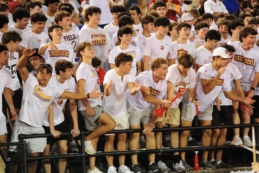 Brother Martin student section celebrates last week's win over Jesuit; looks for another against Rummel on Friday.