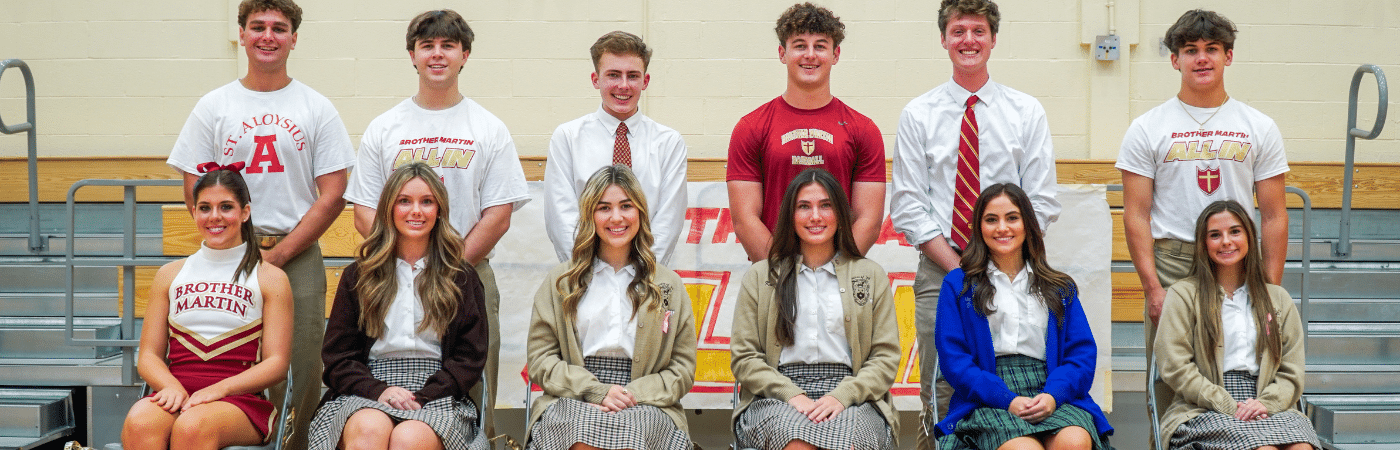 The Brother Martin Robert M. Conlin Gymnasium was abuzz with Crusader excitement this morning during our 2023 Homecoming Pep Rally. There, we celebrated our swimming, football, and cross country teams. The pep rally was led by our student council, and future Crusaders taking part in their School Day Tours were in attendance. The NJROTC looked as sharp as their swords as they presented the sword arch for our 2023 Homecoming Court and their nominators to pass beneath. A friendly game of faculty versus student dodgeball ensued - our Crusaders claimed victory! The Crusader band performed exceptionally well, and the Brother Martin cheer team helped pump us up for the upcoming events of our Crusader athletics teams. The Crusader Spirit made an electrifying appearance as well, bestowing the Crusader helm upon Mr. Barry Hebert '74 (Director of School Services, Alumni Relations).