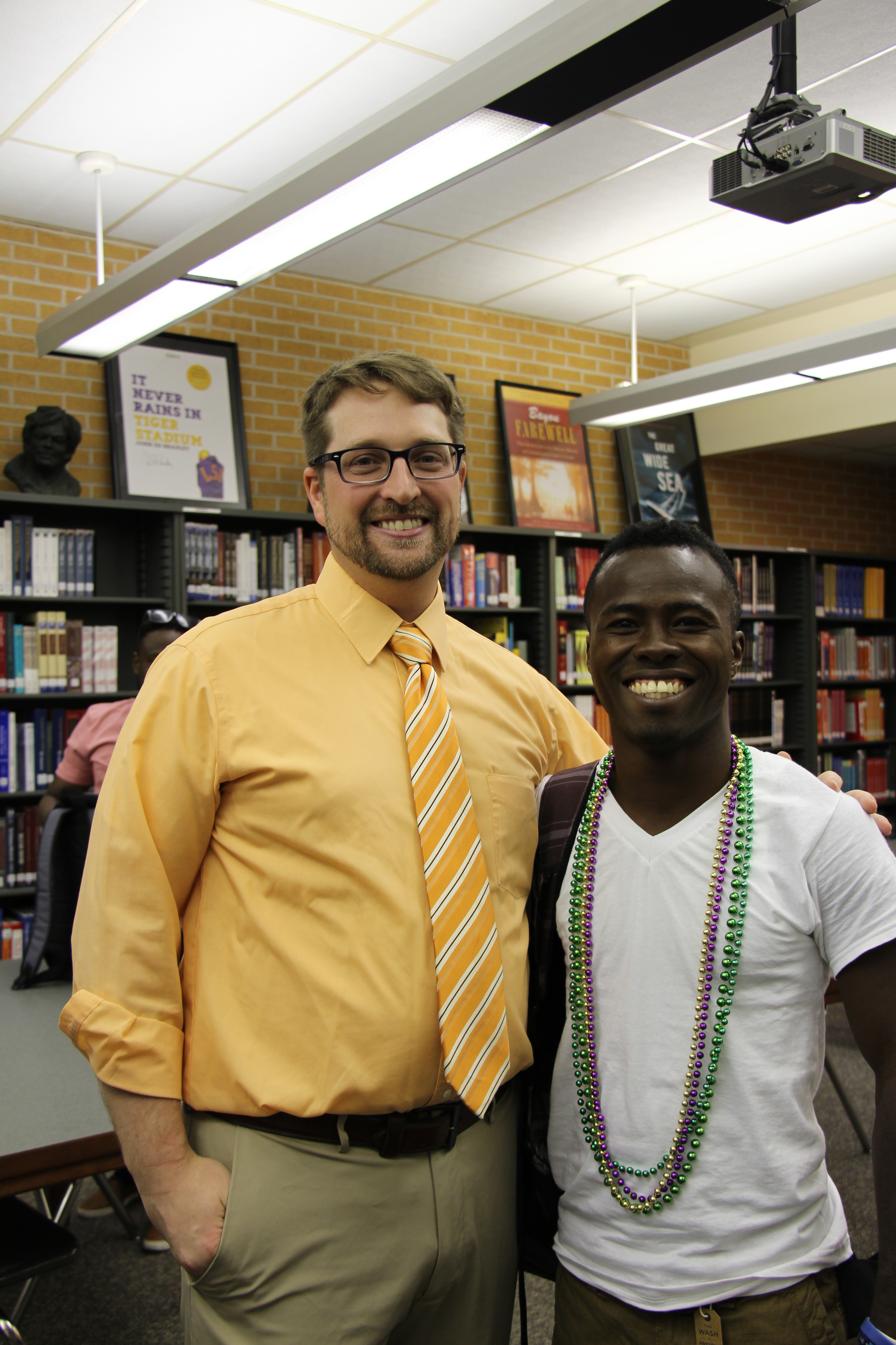 Upon arrival, the visitors were welcomed by Assistant Disciplinarian Mr. Michael Lynn, Jr. ’04, administration, faculty, staff, and students of Brother Martin in the library. An advanced French student started the morning with a prayer spoken in French. Students also introduced themselves to our guests in French. Then, a continental breakfast was served before the morning’s events began. They first learned about the history of the Brothers of the Sacred Heart in New Orleans from Mrs. Keiren Aucoin.
