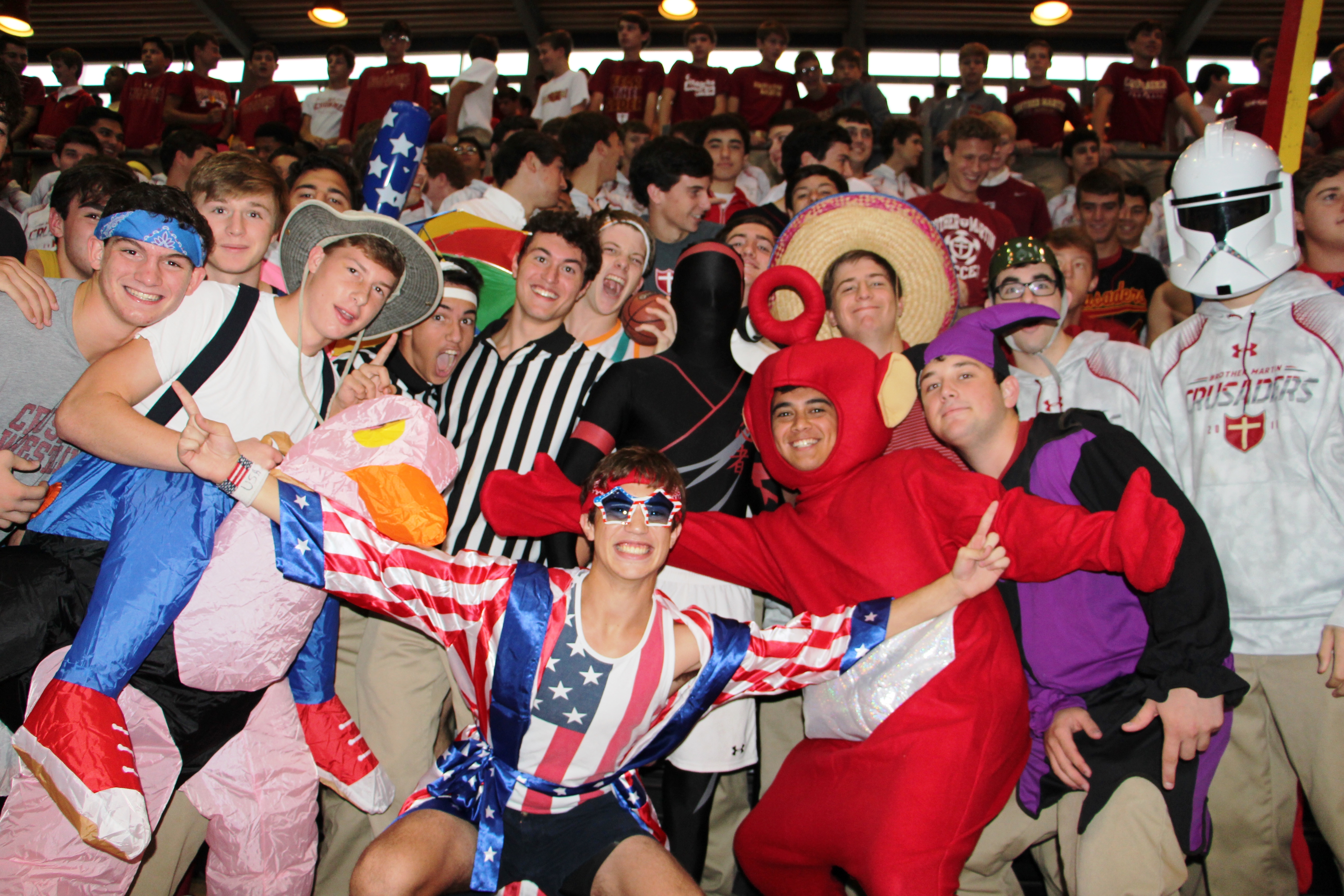 Brother Martin students, faculty and guests joined to together in the Conlin Gym for the FIRST Pep Rally honoring the 2015- 2016 Cross Country and the Crusader Football teams. The theme of the pep rally was “Crazy Crusader” where students dressed up in their favorite “Crazy Crusader” gear and showed off their school spirit with contests, relay races, and a spirit video called “What is Rock-A-Chaw?” Varsity football head coach Mark Bonis addressed the crowd about coming out to see the Crusaders play in tonight’s game against St. Stanislaus. In addition, the Crusader Cheerleaders and Band were in attendance to help rock the stands with cheers and music along with a special appearance from the ‘Spirit’.