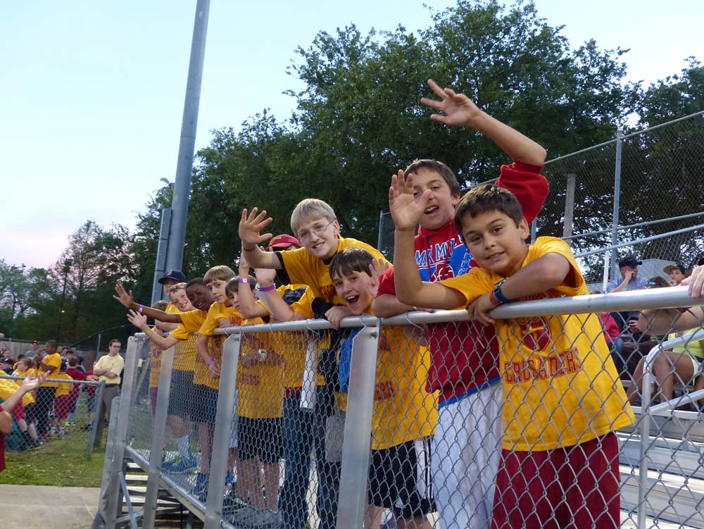 250 elementary and middle school boys attended the first ever Crimson and Gold Night on Brother Martin’s campus this past weekend. Outfitted with a festive Crusader t-shirt, the students enjoyed a variety of outdoor and indoor activities, including volleyball, badminton, and four square, as well as a gym full of “minute-to-win-it” games. They also enjoyed pizza, chips, and cookies in the Benson Mall and had Crusader posters signed by Crusader alumni who played college and professional sports. The evening ended with prizes and then a bus ride to the Brother Martin–Rummel baseball game at Kirsch Rooney, where the crowd watched the Crusaders expand their winning streak to 11 games, with a 2-1 victory over the Raiders. Thank you to all of these young boys who experienced the Crusader spirit!