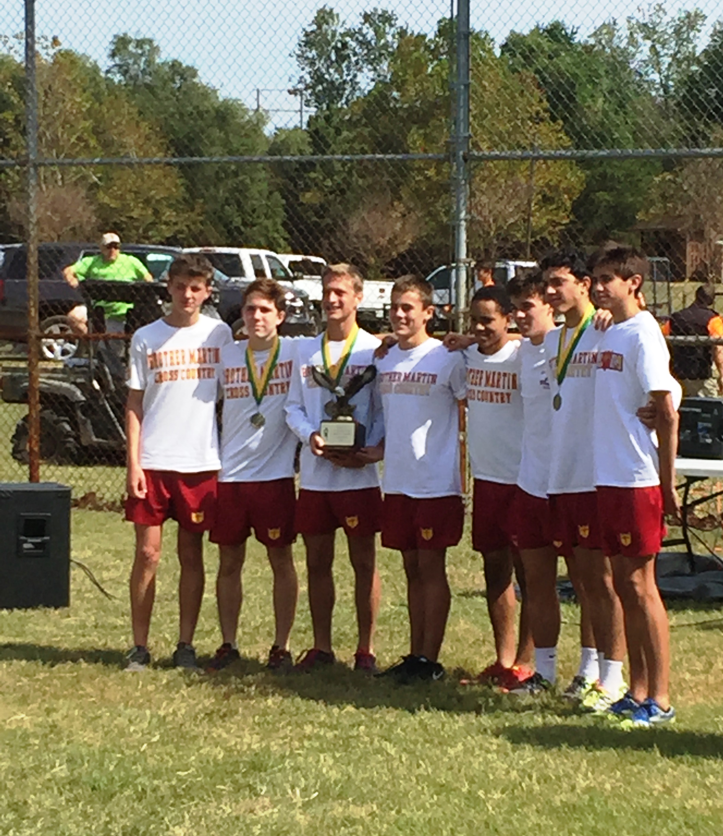 The Varsity Cross Country team was victorious on Saturday, October 17, 2015 at the Menard Invitational in Alexandria, tallying a low score of 31 points to outdistance the field of 14 teams. Hayden Courrege ’18 claimed the individual title, falling three seconds short of setting a Fort Buhlow course record. Hunter Appleton ’19 finished 2nd overall behind Courrege. Benjamin Crowley ’18 and Myles Ceravolo ’17 finished inside the Top 10, while Tyler Epps ’18, Jonathan Henneberg ’16, Marco Perez ’18, and Reid Kern ’17 all finished in the Top 25 to pace the total team effort.