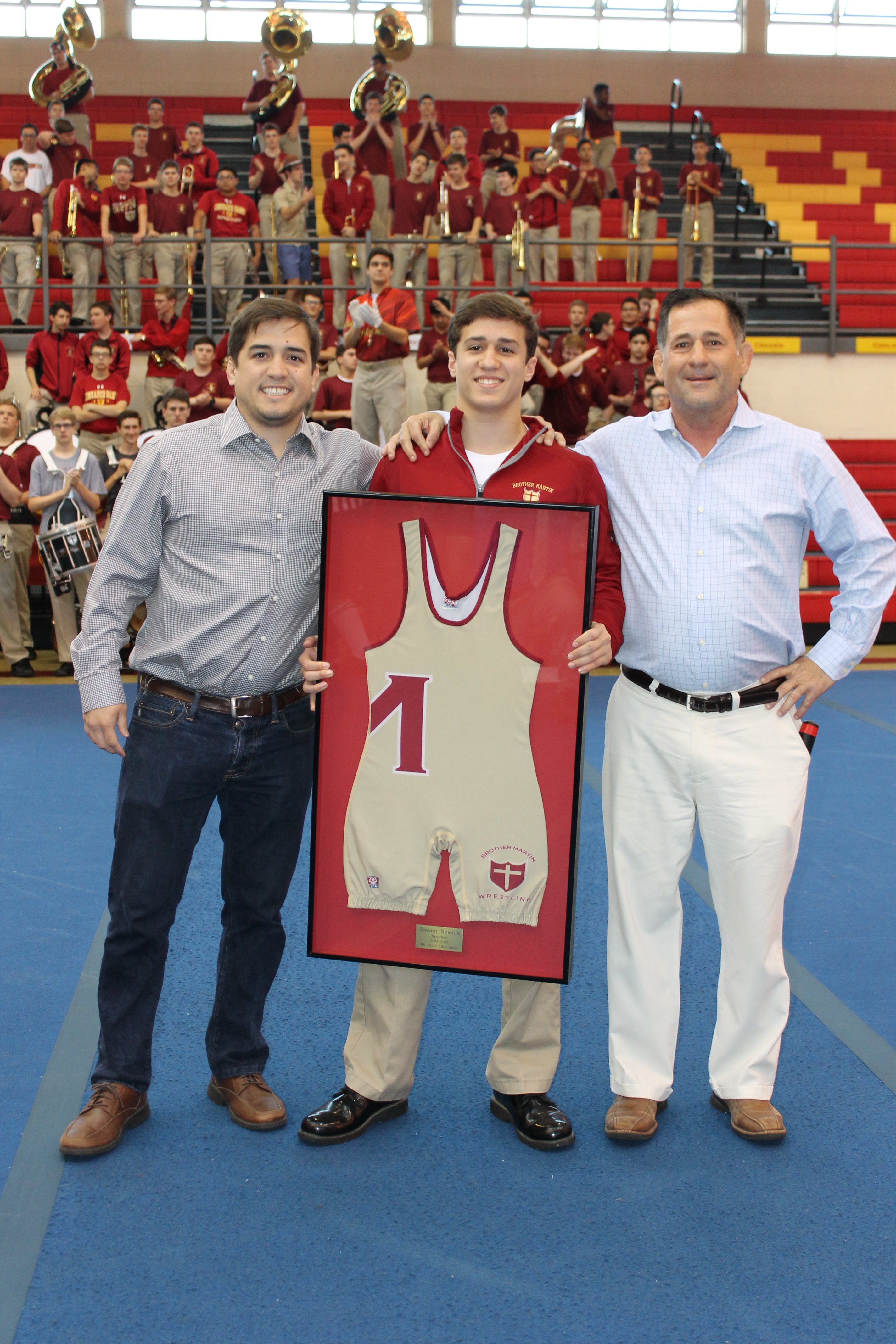 The final Pep Rally of the school year was held on Friday honoring spring athletics. Coach Robbie Dauterive ‘84 and Coach Duffy Rousselle welcomed all and got the crowd ready with the famous ‘Spirit Sword’. Coach Dauterive introduced our District Championship soccer team and our State Semi-Finalist basketball team. Then, Coach Dauterive honored Steven Shields ‘17 who is a four- time State Wrestling Champion, and only the second wrestler to receive that honor at Brother Martin. Shields has the all time school wrestling record with 183 wins. In addition, he is the current 132 lb. weight class State Champion, and he was honored with his framed singlet that will reside in the Ridgley Center ‘Hall of Champions’ display.