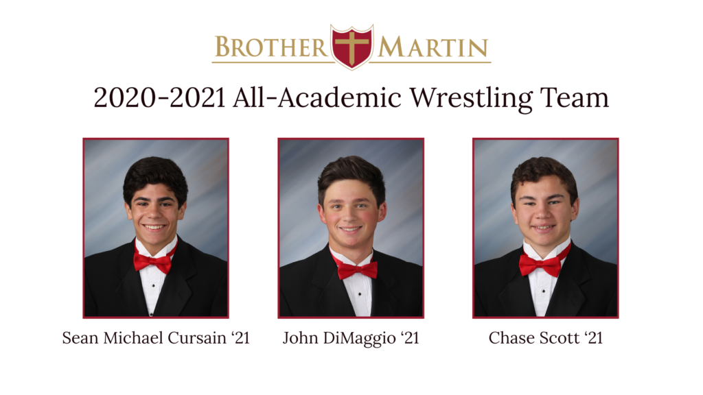 The Brother Martin senior wrestlers named to this year’s All-Academic team are Sean Michael Cursain '21, John DiMaggio '21, and Chase Scott '21. Brother Martin is proud of these student-athletes for their outstanding talent and hard work in the classroom and on the mat.