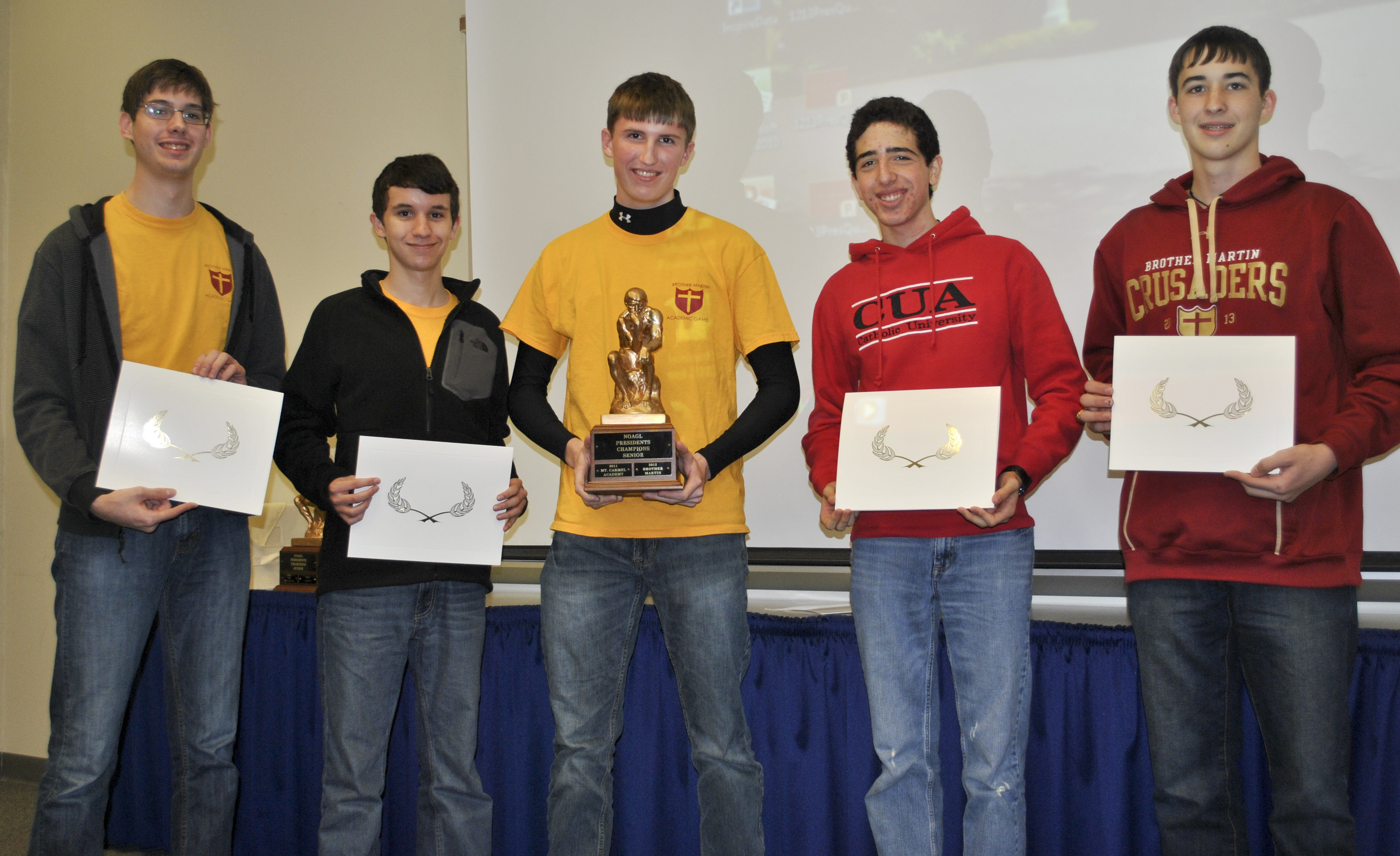 This past Saturday our Academic Games team competed in a tournament testing their knowledge of American history and the U.S. Presidents. The Senior team, comprised of Owen Bouchon, Nick Brilli, Christopher Maheu, Matthew Reineke, and Brandon Yrle, took 1st Place keeping the tournament trophy at Brother Martin. Team members Brandon Yrle and Nick Brilli finished in the Top 10, and Matthew Reineke was the 2nd Place overall individual. The Junior team finished 2nd, with Dylan McMullen, Chochy Lousteau, and Charles Long placing in the Top 10. Team captain Joseph Arrigo was the individual winner in Junior Division for the second year in a row. Congratulations team on a job well done!