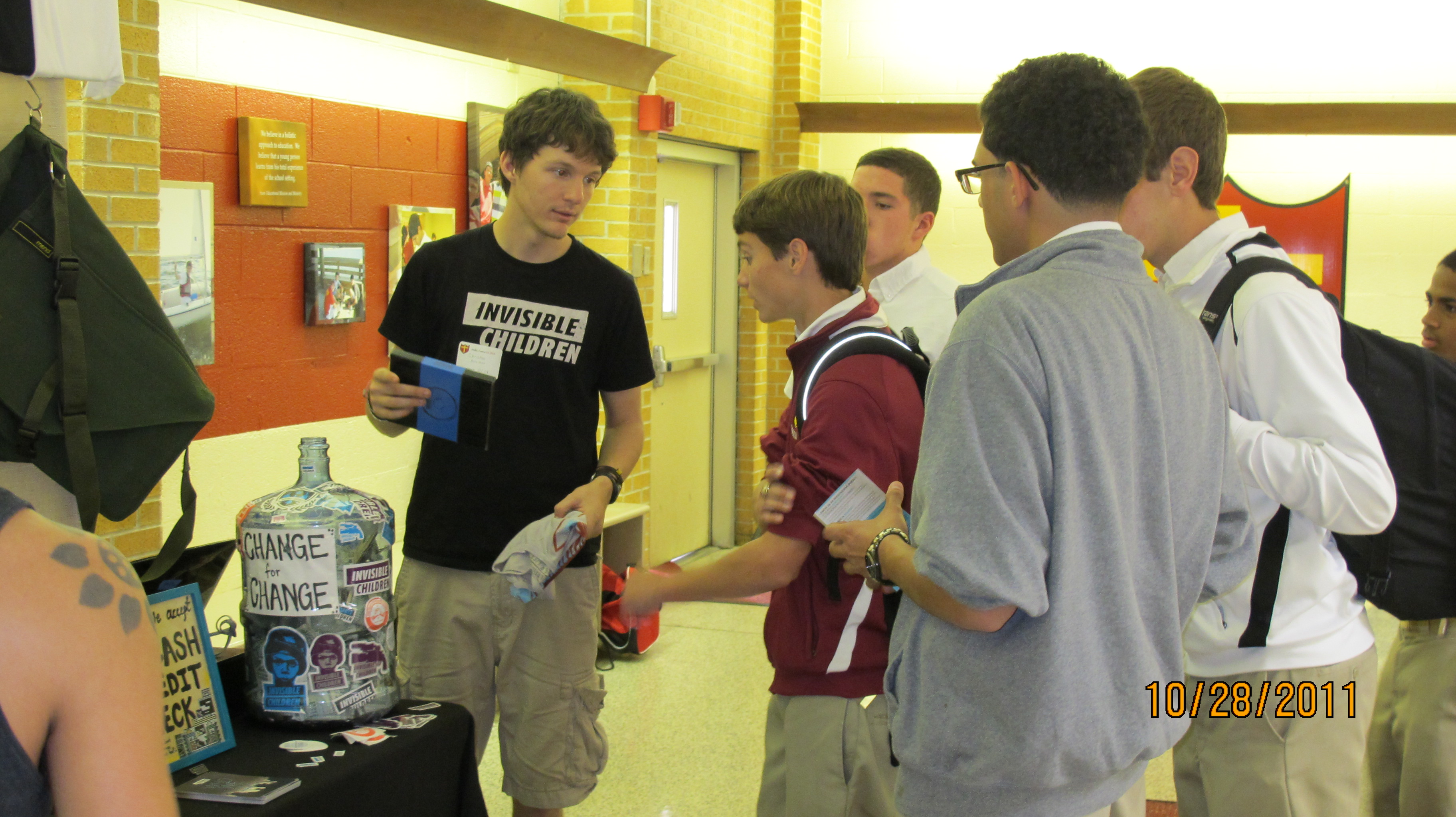 Friday morning, members of an organization called “Invisible Children” gave a presentation to a school-wide assembly on the issue of children soldiers in the world’s longest running armed conflict.  The student body and faculty saw a 35 minute documentary entitled, “Tony” which followed the life of a child soldier in Uganda and the Invisible Children organization’s efforts to help him and children like him.  After the documentary, Collins, a young woman from Uganda, spoke to the assembly about what it was like to grow up in a country that has been in violent conflict her entire life.  “Roadies” from Invisible Children stayed after the assembly and set up a table in the Mall for students to learn more about the issue and buy merchandise to support the efforts of Invisible Children.  After school, over two dozen students met with the presenters to find out how they could help the invisible children of Africa.