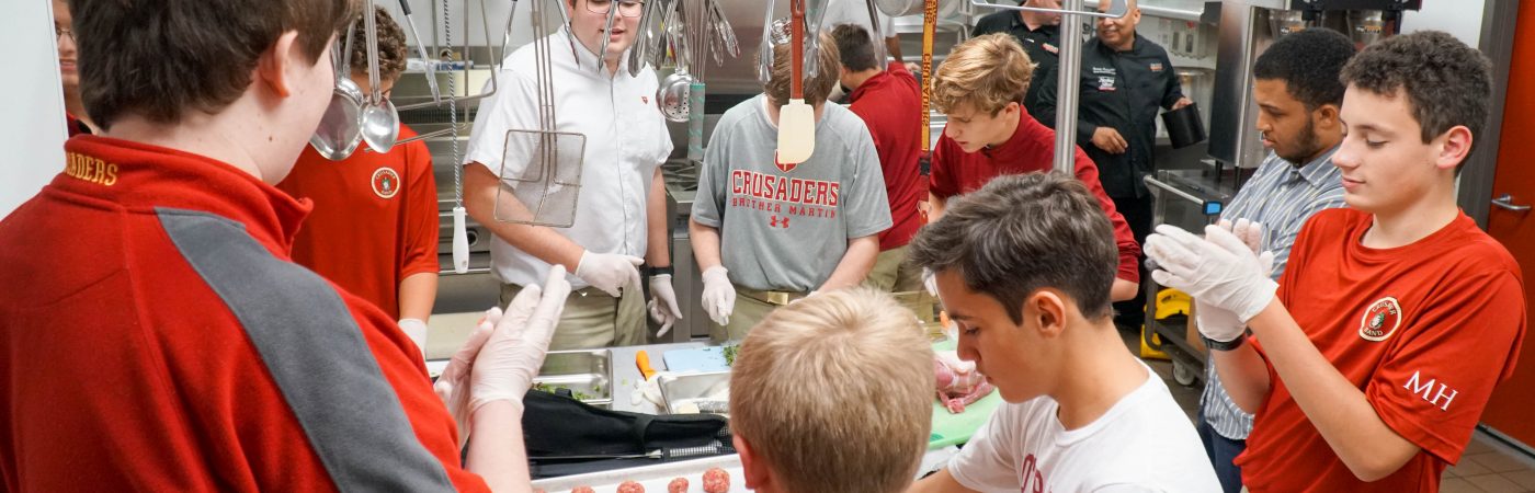 The Culinary Crusaders, moderated by Donnie Midkiff '03, Chris Vicknair, and Tina LaBeaud, were back in action in October, partnering with Reinhart Food Service at their club meeting. In the kitchen, these Crusaders spent an afternoon with Reinhart Foodservice's Director of Business Development John Ace Hildebrand, Sales Representative Eric Dejean, and Division Chef Demetrio Marquez learning about their art and passion for serving and providing quality food for their customers.