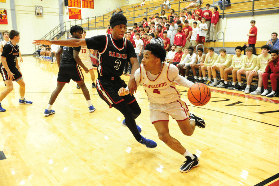 Brother Martin point guard Raphael Bickham ‘27 drives past a Hannan defender during second-half play in the season-opener at Brother Martin. Bickham led the Crusaders in scoring with 16 points.